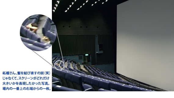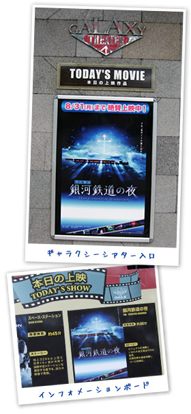 もう○○年ぶりのギャラクシーシアター。学生時代に見た時、あまりのスクリーンの大きさで上映中に気分が悪くなったため、それ以来入ったことがありませんでした。が、今回入ってみると、そこまで大きいとは思いませんでした。これって成長したからなんでしょうね(^_^;)それでもかなり大きいスクリーン。こんな巨大スクリーンに銀河鉄道の夜が映し出されるというのだからワクワクしないはずがありません!!誰もいない間に場内の端から写真を撮ってみました。